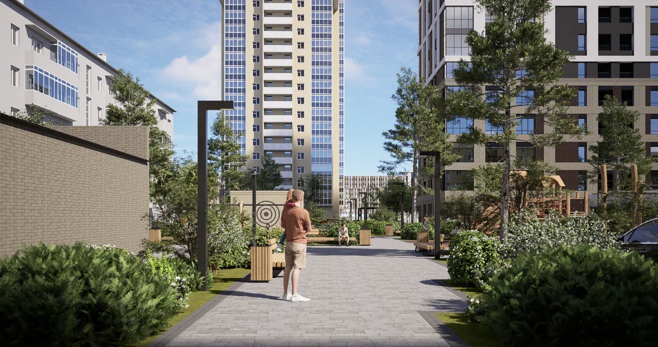 В доме будет отдельный парадный вход с администратором и охраной. А в закрытом дворе: ландшафтное благоустройство с ковровыми посадками, зеленая лужайка для игр, разноуровневое освещение, экологичные детские комплексы и спортивные площадки.
